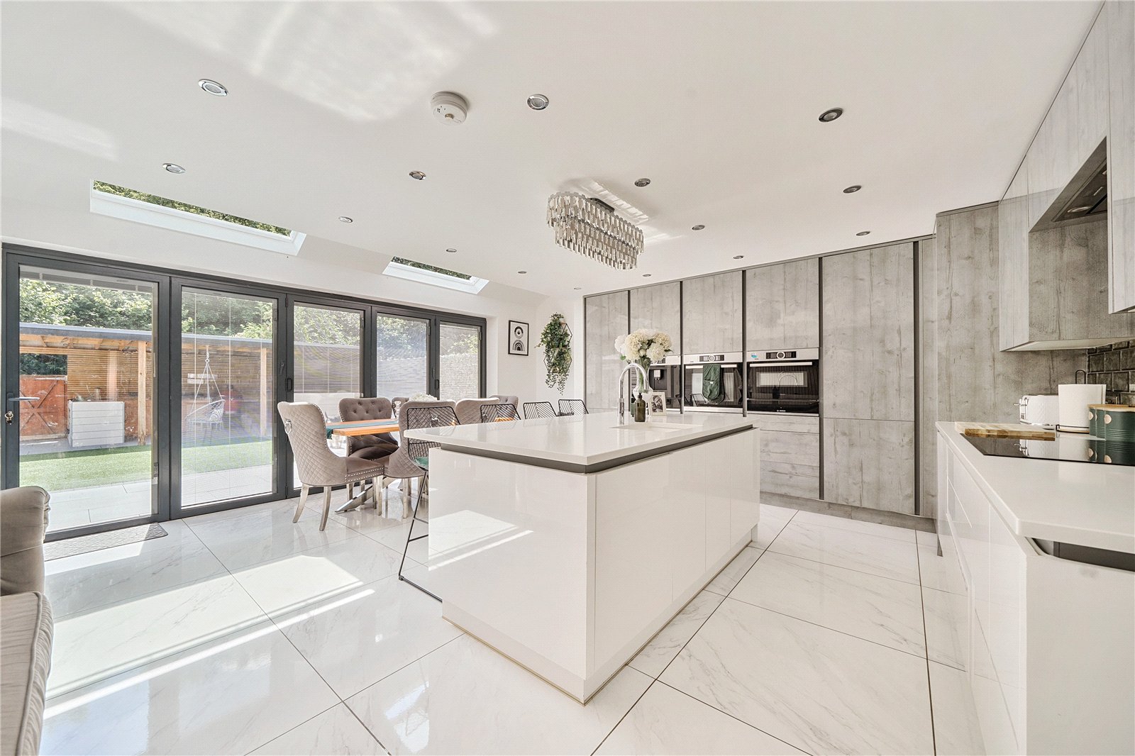 The expansive ground floor includes an entrance hall, living room with bay window, and stunning open-plan kitchen/dining family room. The rear extension floods the space with natural light, blending indoor and outdoor areas beautifully with Velux skylights and bi-fold doors. Further features include a refitted utility room, home office (partially converted from the garage), and modern WC.