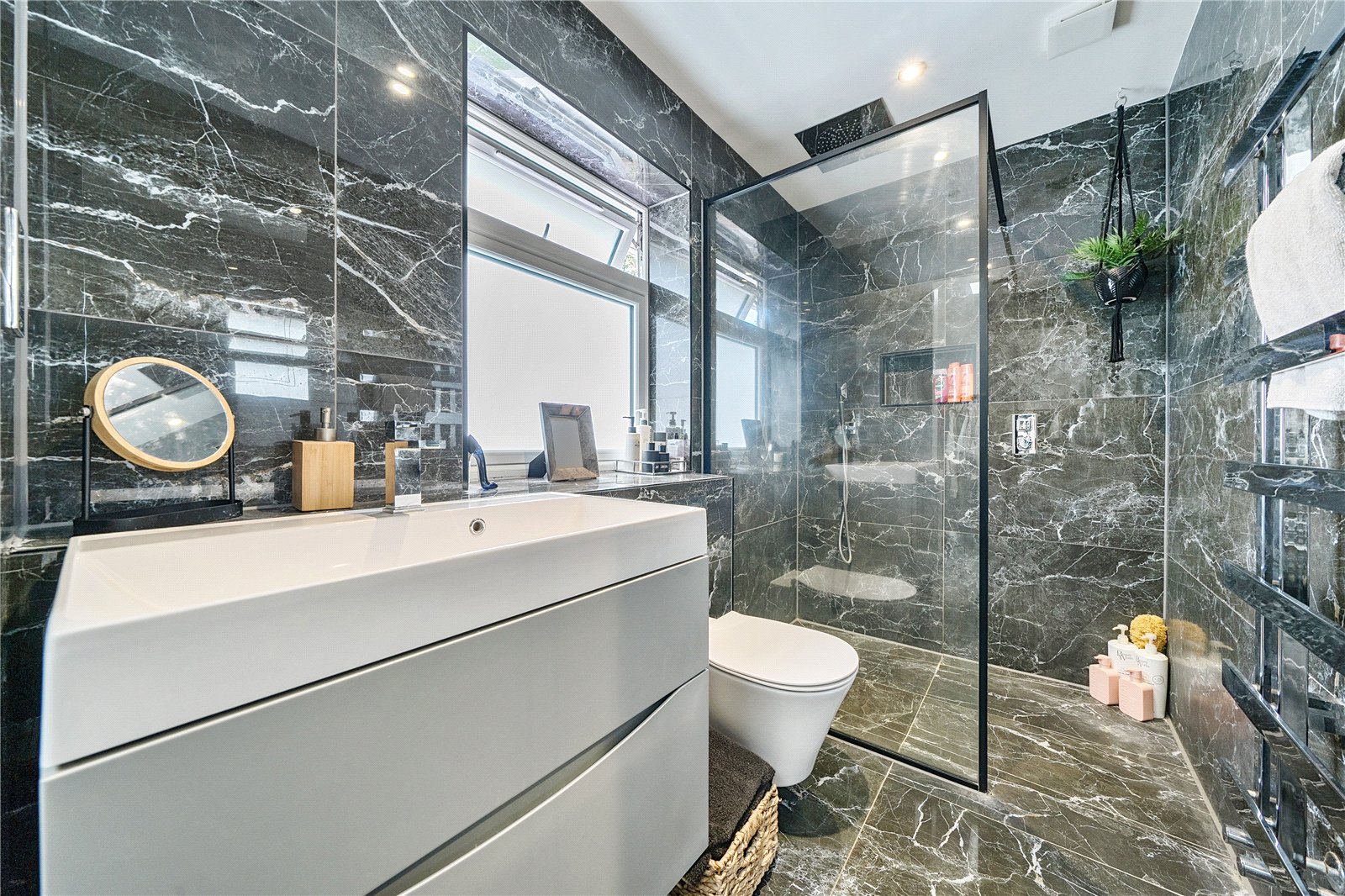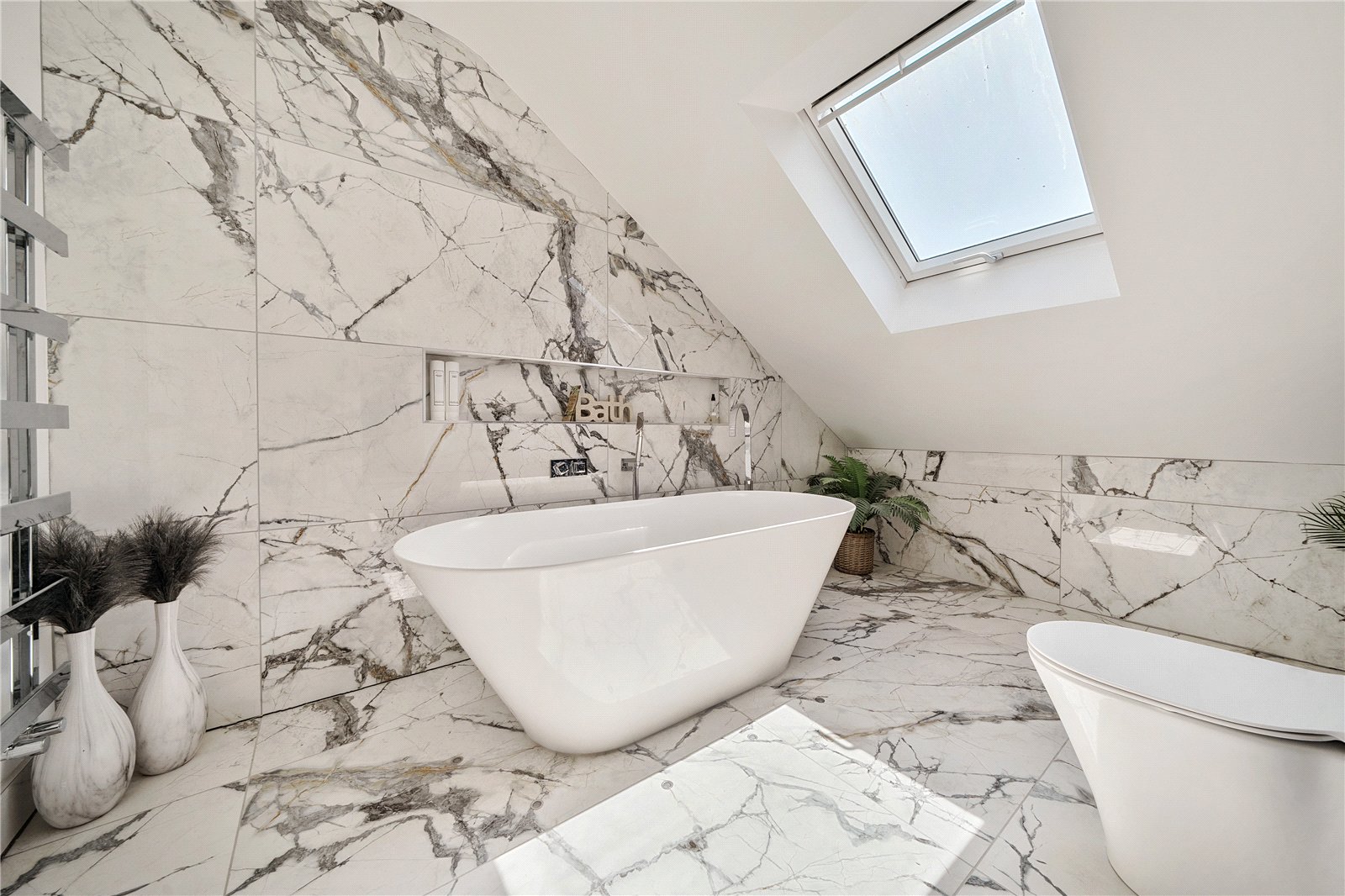 The first floor has four well-proportioned bedrooms, a Jack & Jill ensuite, and a luxurious family bathroom with a TV. The master suite offers a spacious walk-in wardrobe and ensuite. The second floor includes a versatile loft conversion, a large landing with chandelier, a cinema room or fifth bedroom with foldable balcony windows and stunning views, plus a bathroom with a freestanding bath.