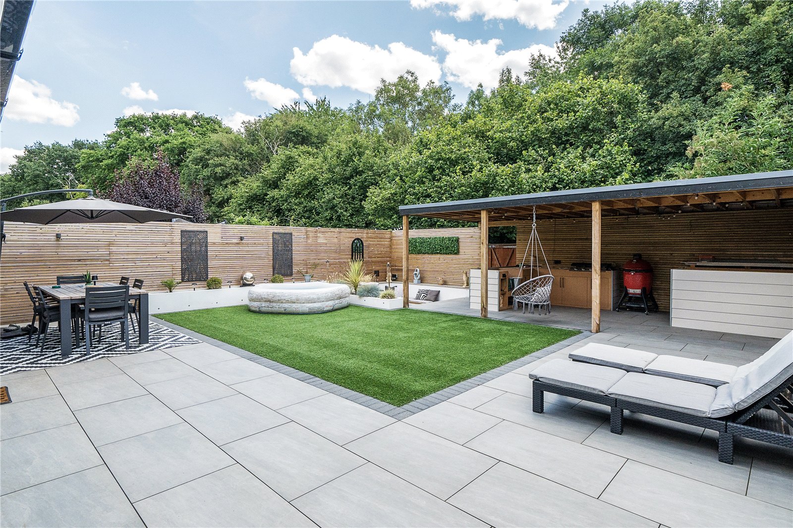 The landscaped rear garden features an outdoor kitchen and inground fire pit with seating, making it a fantastic space for entertaining or alfresco dining. The front of the property has ample driveway parking with garage and side access.