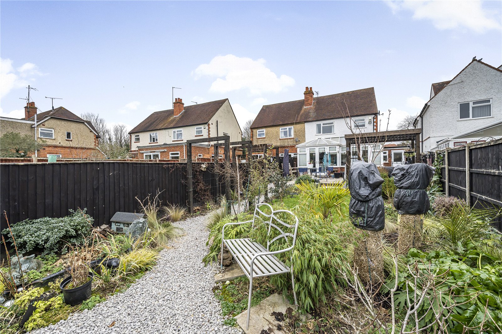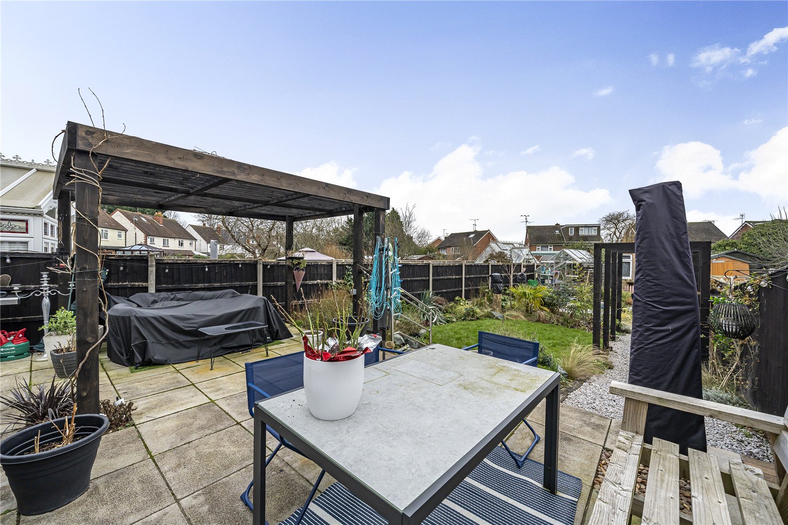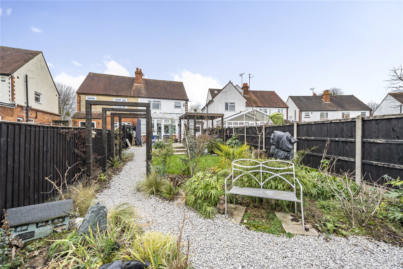 The garden starts with a patio area and a pergola over part of the patio, it then becomes an area of plants and shrubs, with a shingle path taking you towards the bottom of the garden.