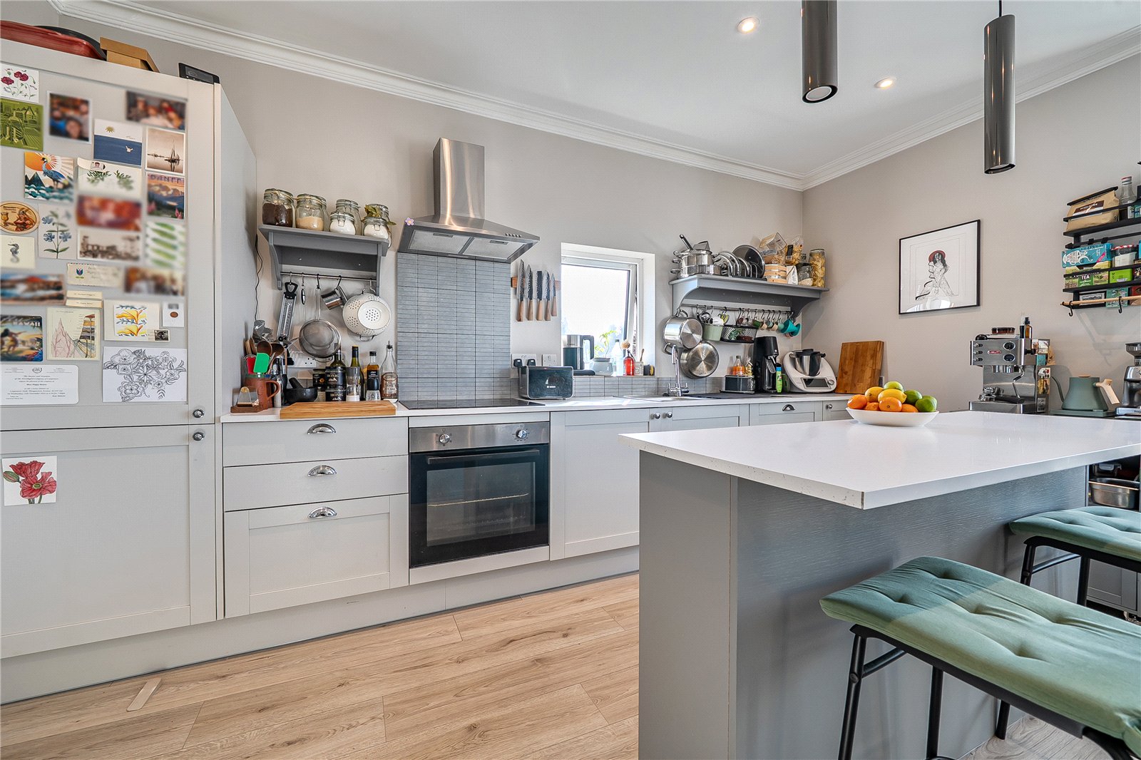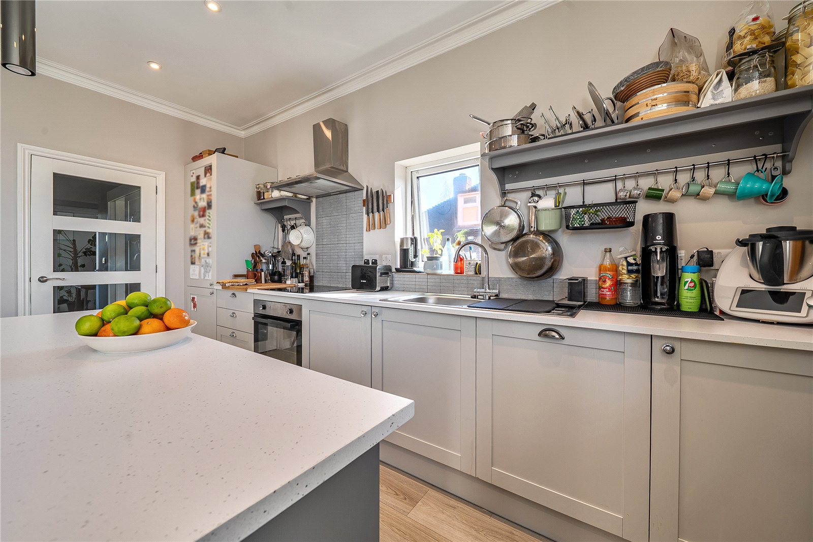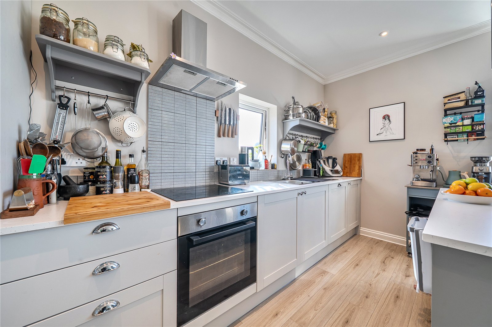 Situated on the first floor, the inviting entrance hall gives access to the beautifully presented kitchen/diner which has a breakfast bar, plenty of wall and base units, oven/hob with an extractor fan and has an integrated fridge freezer, washing machine, and dishwasher.