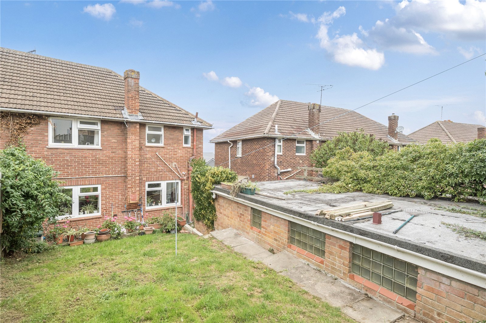 The kitchen has a side access door to the shared driveway, and a range of fitted wall and base units.